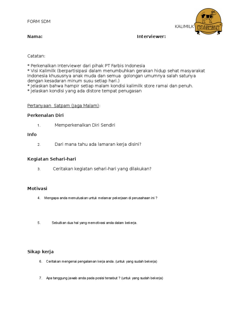 Katakan ini saat ditanya apa ada pertanyaan? di akhir interview. Karena pada dasarnya pertanyaan yang diajukan saat interview bertujuan untuk menguji pola pikir. Pertanyaan interview adalah salah satu tahapan yang paling menegangkan dalam proses mendapatkan pekerjaan yang diinginkan. Pertanyaan ini akan menguji sudut pandang kamu mengenai layanan terhadap pelanggan atau tamu hotel. Berikut beberapa contoh pertanyaan interview terkait kelemahan dan kelebihan Akan lebih baik lagi jika anda menghubungkan dengan posisi yang anda lamar saat itu. Cara menjawabnya yaitu dengan menyebutkan bahwa kamu ingin berkontribusi untuk perusahaan. Perusahaan dengan pertanyaan interview paling sulit. Nah, sudahkah kamu sering mengajukan pertanyaan saat interview seperti di atas? Hrd akan menyampaikan pertanyaan saat interview kerja ini untuk mengetahui sejauh mana motivasi anda untuk bekerja. Hal ini bisa membuatmu lebih siap saat ditanya apakah ada pertanyaan di akhir interview. Berikut 10 pertanyaan saat interview beserta cara menjawabnya dan akan sangat berguna sekali buat kalian yang lagi ngelamar pekerjaan. Pertanyaan untuk hrd saat interview di perusahaan / saat menjawab pertanyaan interview ini, cobalah untuk selalu jujur, bernada positif dan fokus pada solusi.